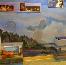 Puppets and their musical instruments inside the bench